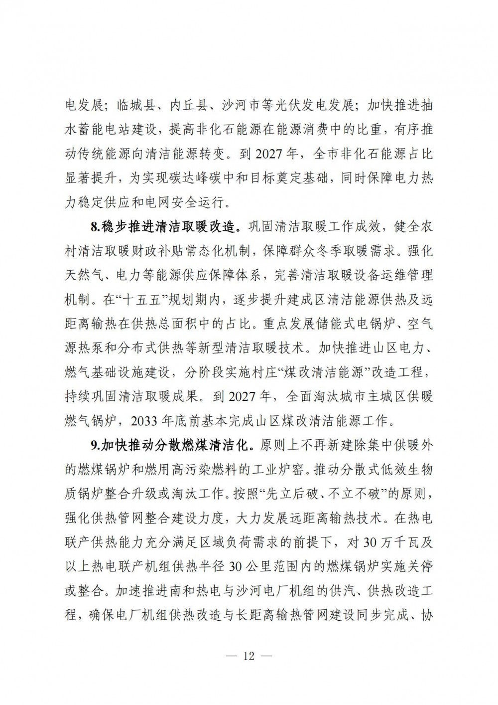 加快推動(dòng)分散燃煤清潔化。原則上不再新建除集中供暖外的燃煤鍋爐和燃用高污染燃料的工業(yè)爐窯。推動(dòng)分散式低效生物質(zhì)鍋爐整合升級或淘汰工作。按照“先立后破、不立不破”的原則,強化供熱管網(wǎng)整合建設力度,大力發(fā)展遠距離輸熱技術(shù)。在熱電聯(lián)產(chǎn)供熱能力充分滿(mǎn)足區域負荷需求的前提下,對30萬(wàn)千瓦及以上熱電聯(lián)產(chǎn)機組供熱半徑 30 公里范圍內的燃煤鍋爐實(shí)施關(guān)?;蛘?。加速推進(jìn)南和熱電與沙河電廠(chǎng)機組的供汽、供熱改造工程,確保電廠(chǎng)機組供熱改造與長(cháng)距離輸熱管網(wǎng)建設同步完成、協(xié)同投運。預留清潔高效的集中供熱設施,結合實(shí)際情況推廣利用電力、太陽(yáng)能等其他可再生能源和清潔能源供熱。到2027年,全面淘汰 65 蒸噸/小時(shí)及以下的工業(yè)燃煤鍋爐,同步做好供熱保障,實(shí)現工業(yè)園區集中供熱全覆蓋,有效減少分散燃煤污染。到2030 年底前,淘汰 30 萬(wàn)千瓦以下燃煤機組供熱(背壓式除外)。