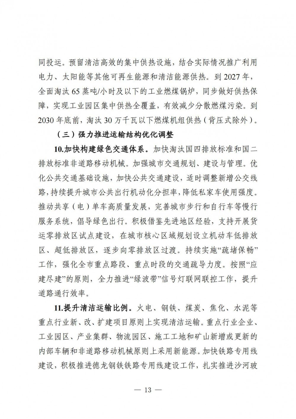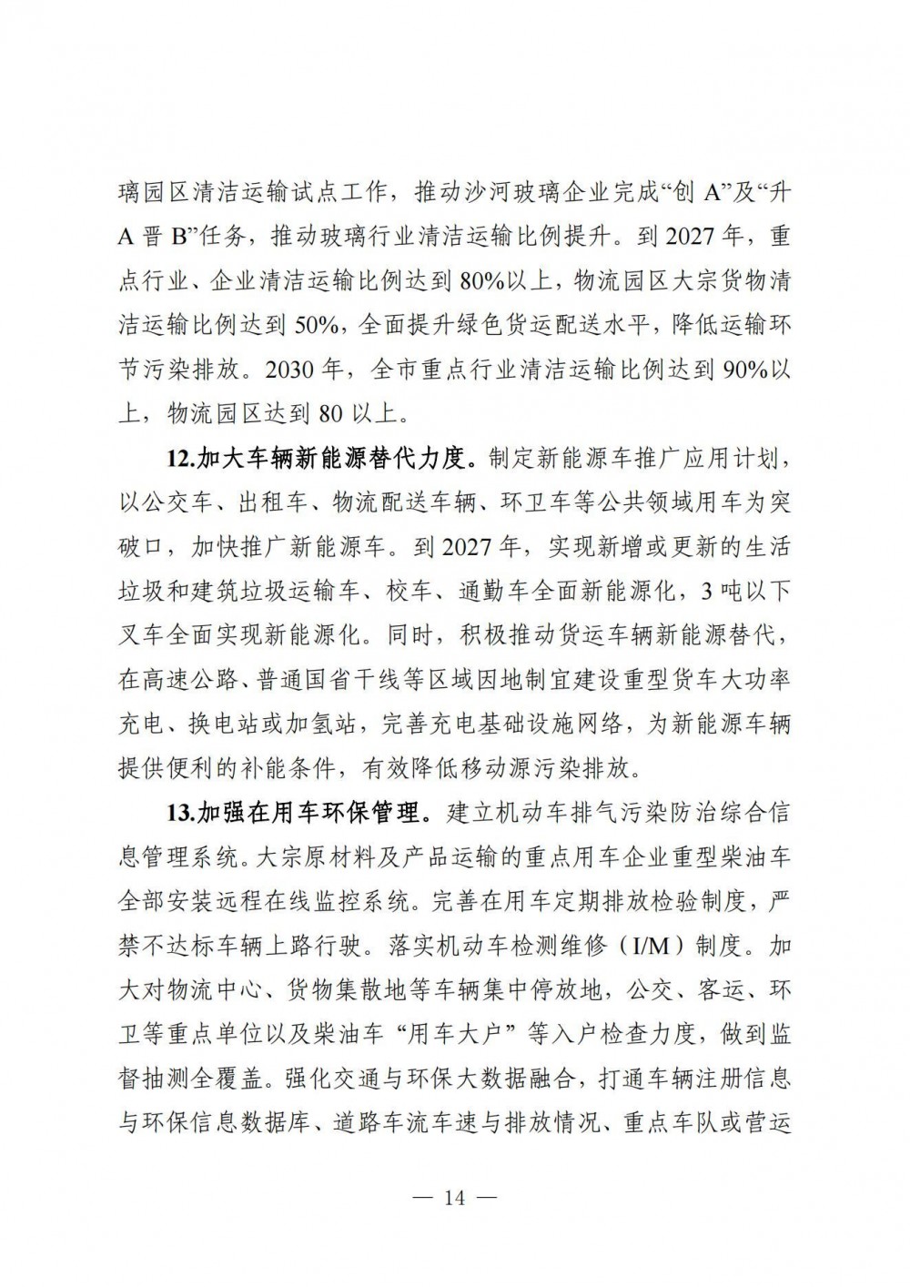 提升清潔運輸比例?;痣?、鋼鐵、煤炭、焦化、水泥等重點(diǎn)行業(yè)新、改、擴建項目原則上實(shí)現清潔運輸。重點(diǎn)行業(yè)企業(yè)、工業(yè)園區、產(chǎn)業(yè)集群、物流園區、施工工地和礦山新增或更新的內部車(chē)輛和非道路移動(dòng)機械原則上采用新能源。加快鐵路專(zhuān)用線(xiàn)建設,積極推進(jìn)德龍鋼鐵鐵路專(zhuān)用線(xiàn)建設工作,扎實(shí)推進(jìn)沙河玻璃園區清潔運輸試點(diǎn)工作,推動(dòng)沙河玻璃企業(yè)完成“創(chuàng )A”及“升A 晉 B”任務(wù),推動(dòng)玻璃行業(yè)清潔運輸比例提升。到2027年,重點(diǎn)行業(yè)、企業(yè)清潔運輸比例達到80%以上,物流園區大宗貨物清潔運輸比例達到 50%,全面提升綠色貨運配送水平,降低運輸環(huán)節污染排放。2030 年,全市重點(diǎn)行業(yè)清潔運輸比例達到90%以上,物流園區達到 80 以上。