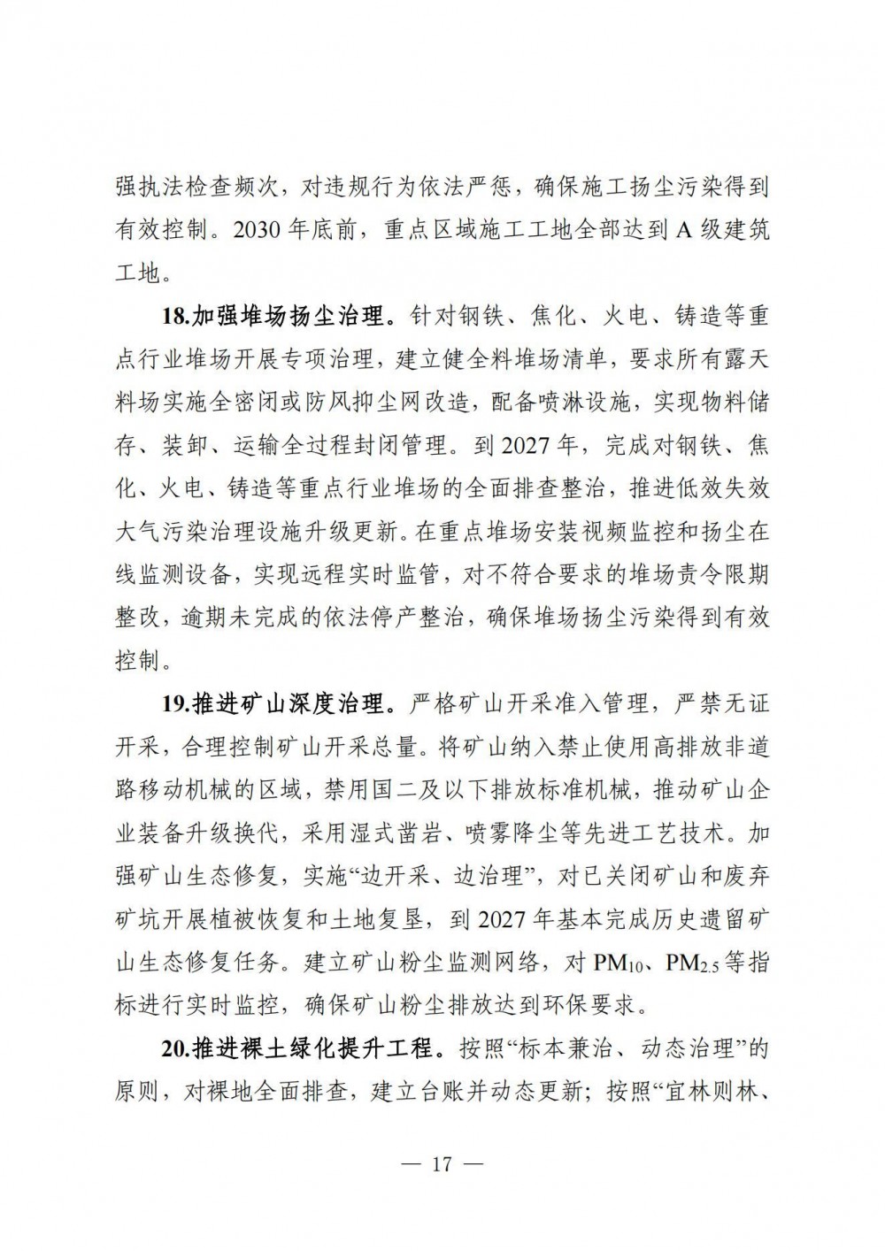 推進(jìn)礦山深度治理。嚴格礦山開(kāi)采準入管理,嚴禁無(wú)證開(kāi)采,合理控制礦山開(kāi)采總量。將礦山納入禁止使用高排放非道路移動(dòng)機械的區域,禁用國二及以下排放標準機械,推動(dòng)礦山企業(yè)裝備升級換代,采用濕式鑿巖、噴霧降塵等先進(jìn)工藝技術(shù)。加強礦山生態(tài)修復,實(shí)施“邊開(kāi)采、邊治理”,對已關(guān)閉礦山和廢棄礦坑開(kāi)展植被恢復和土地復墾,到2027 年基本完成歷史遺留礦山生態(tài)修復任務(wù)。建立礦山粉塵監測網(wǎng)絡(luò ),對PM10、PM2.5等指標進(jìn)行實(shí)時(shí)監控,確保礦山粉塵排放達到環(huán)保要求。