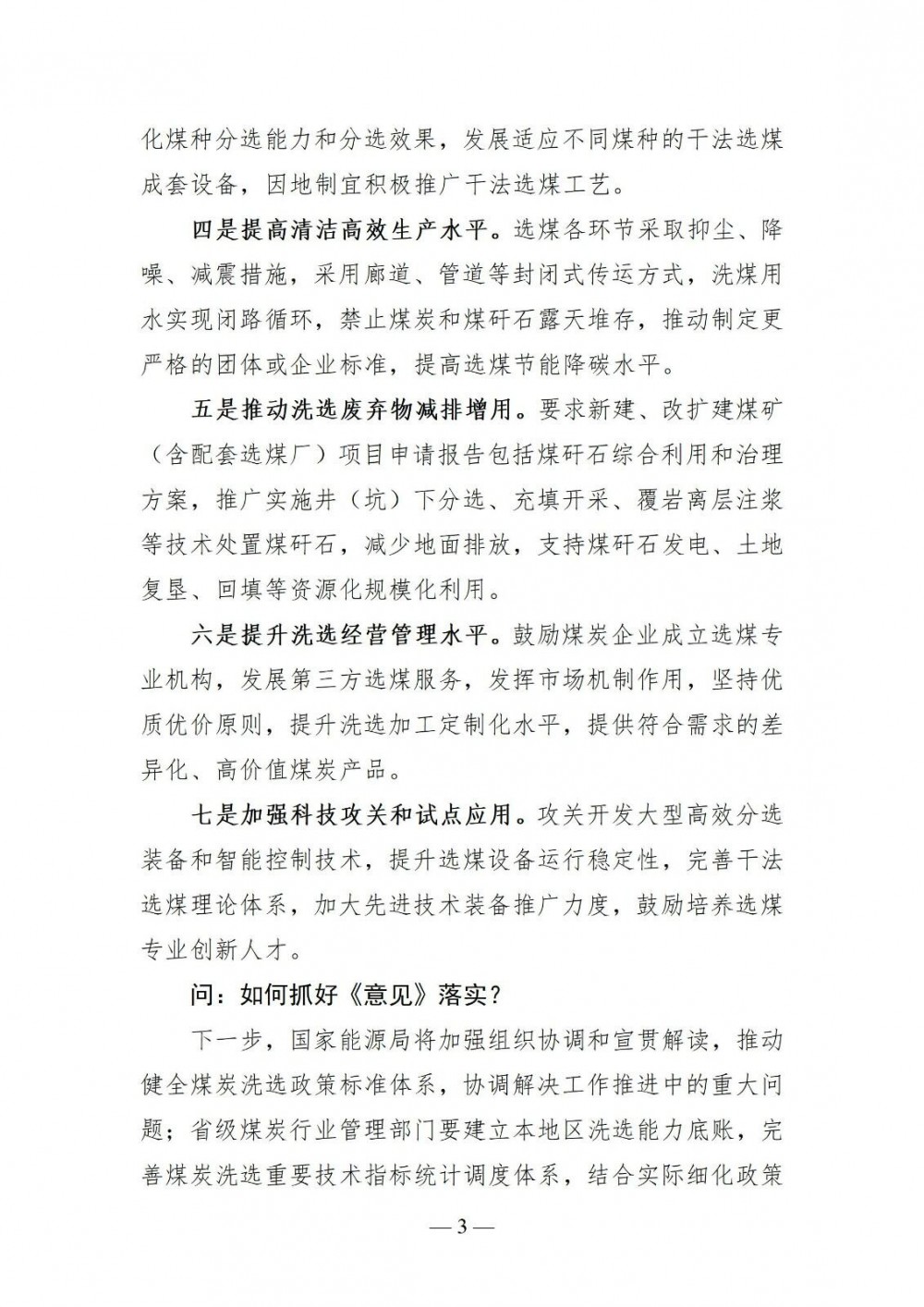 (一)強化組織實(shí)施。國家能源局強化行業(yè)統籌,會(huì )同有關(guān)部門(mén)加強對煤炭洗選工作的指導協(xié)調,推動(dòng)健全煤炭洗選政策標準體系,協(xié)調解決工作推進(jìn)中的重大問(wèn)題。省級煤炭行業(yè)管理部門(mén)要建立本地區洗選能力底賬,完善煤炭洗選重要技術(shù)指標統計調度體系,結合實(shí)際細化政策措施,積極用好綠色信貸、碳減排支持工具、中央預算內資金等支持政策,推進(jìn)煤炭洗選產(chǎn)業(yè)升級。有關(guān)重點(diǎn)煤炭企業(yè)特別是中央企業(yè)要發(fā)揮引領(lǐng)作用,推動(dòng)煤炭洗選技術(shù)和管理模式創(chuàng )新。