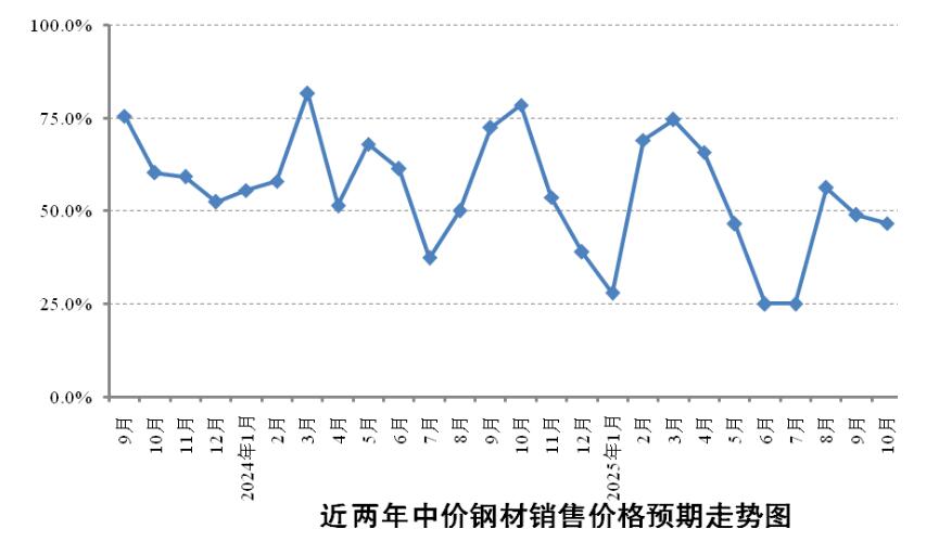 據對全國重要鋼材批發(fā)市場(chǎng)調查,10月鋼材批發(fā)市場(chǎng)銷(xiāo)售價(jià)格預期指數、購進(jìn)價(jià)格預期指數分別為46.67%、54.46%,比上月分別下降2.26、1.57個(gè)百分點(diǎn),分處50%分界線(xiàn)上下,反映出市場(chǎng)預計鋼材價(jià)格將偏弱運行。