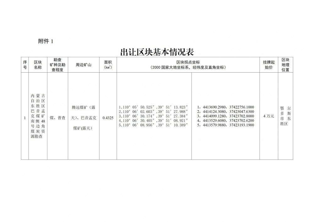 (一)出讓區塊名稱(chēng):內蒙古自治區東勝區巴音孟克煤礦南側48號邊角煤炭資源勘查探礦權;