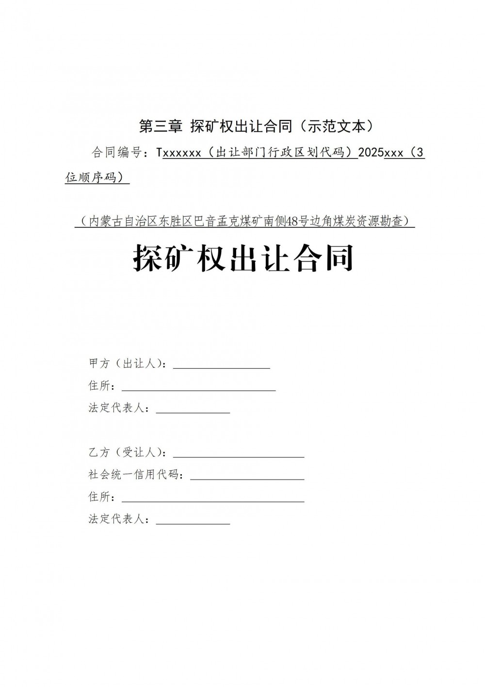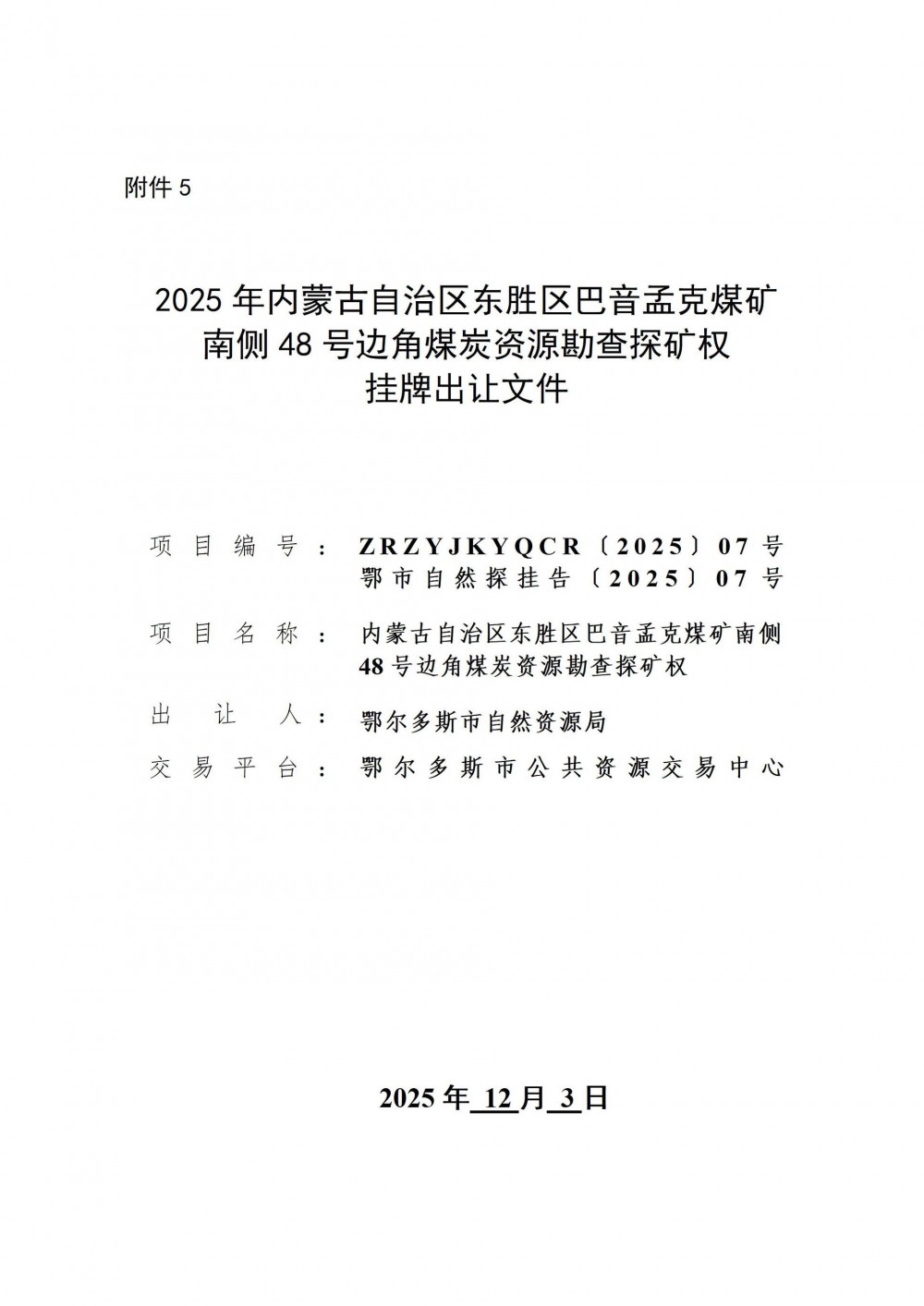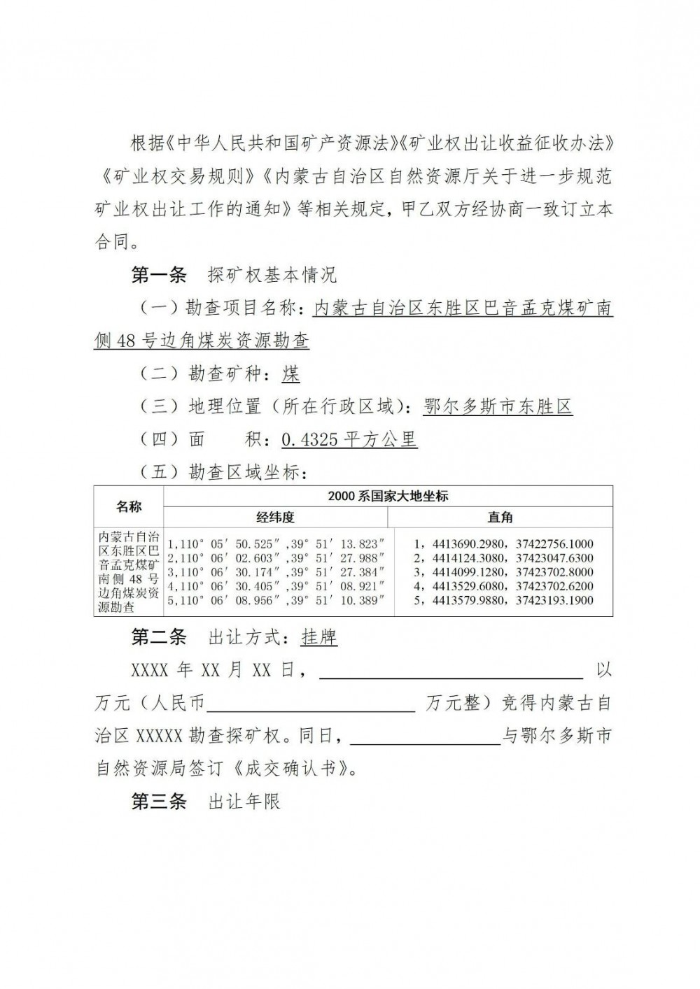 (五)《內蒙古自治區東勝區巴音孟克煤礦南側48號邊角煤炭資源勘查探礦權掛牌出讓文件》