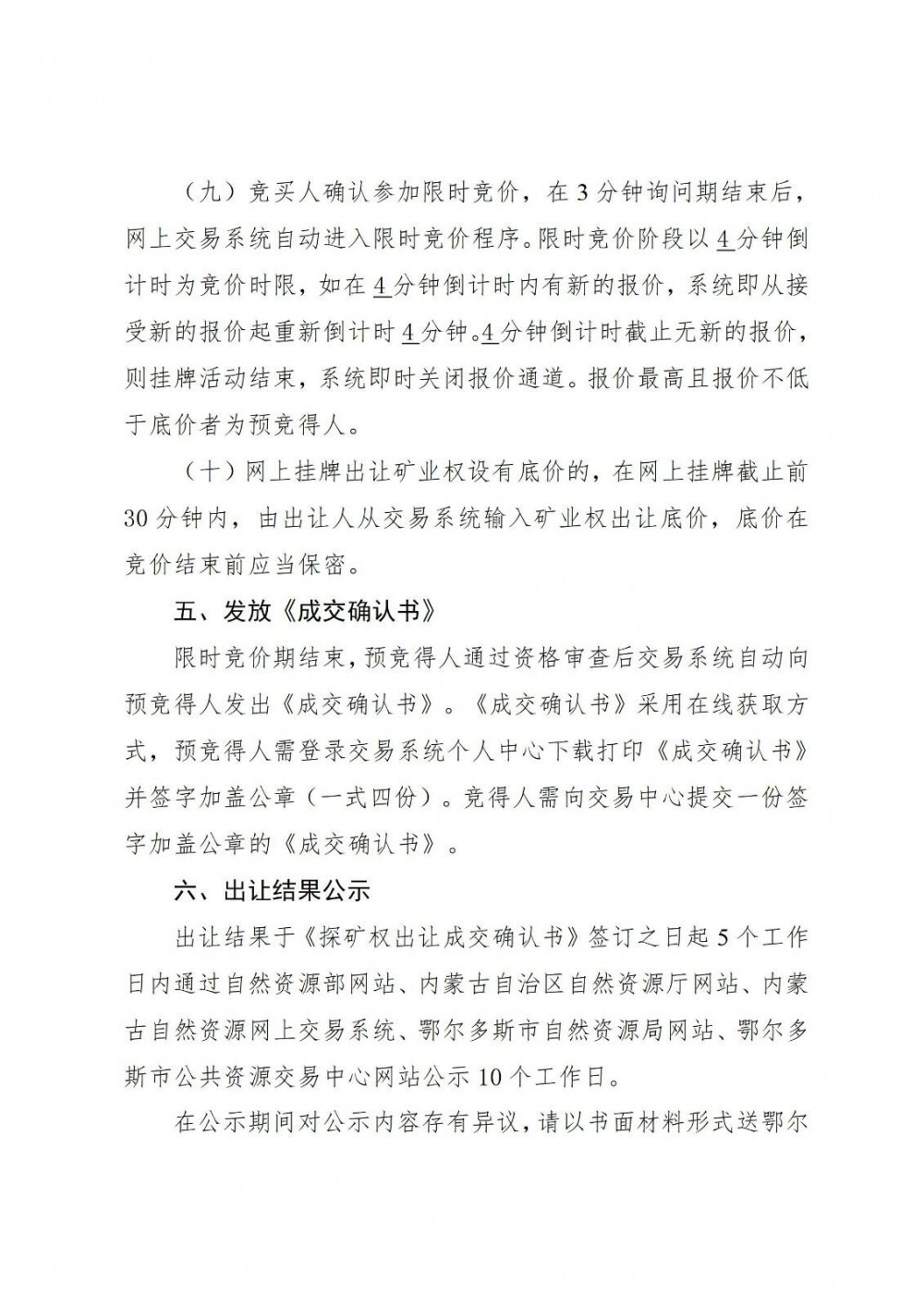 成交結果將于《探礦權出讓成交確認書(shū)》簽訂之日起5個(gè)工作日內通過(guò)自然資源部門(mén)戶(hù)網(wǎng)站、內蒙古自治區自然資源廳門(mén)戶(hù)網(wǎng)站、內蒙古自治區自然資源網(wǎng)上交易系統、鄂爾多斯市自然資源局網(wǎng)站、市公共資源交易中心門(mén)戶(hù)網(wǎng)站公示10個(gè)工作日。