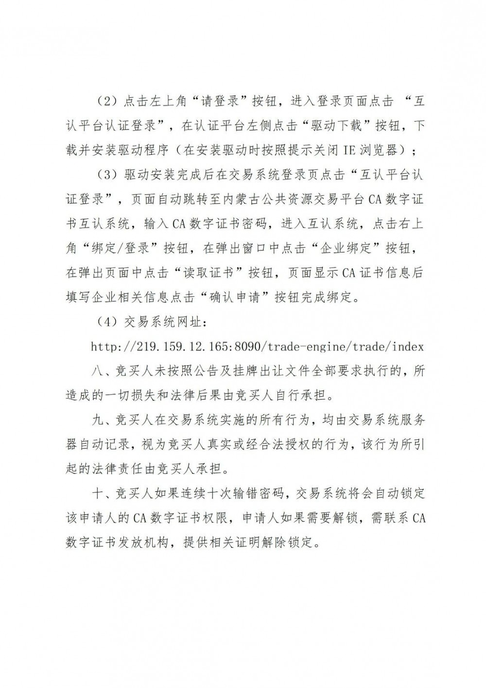 (五)競買(mǎi)人如果連續十次輸錯密碼,交易系統將會(huì )自動(dòng)鎖定該申請人的CA數字證書(shū)權限,申請人如果需要解鎖,需聯(lián)系CA數字證書(shū)發(fā)放機構,提供相關(guān)證明解除鎖定。