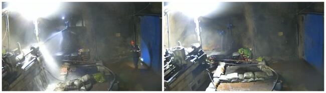 定點(diǎn)注漿鉆孔涌水情況 (左圖:加固前 右圖:加固后)